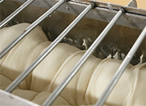 やわらかい生地はそのままでは切断できないため、冷蔵庫へ自動搬送し、24時間程寝かせる。十分に冷やすことで生地が硬くなり、一定の厚さで切断しやすくなる。