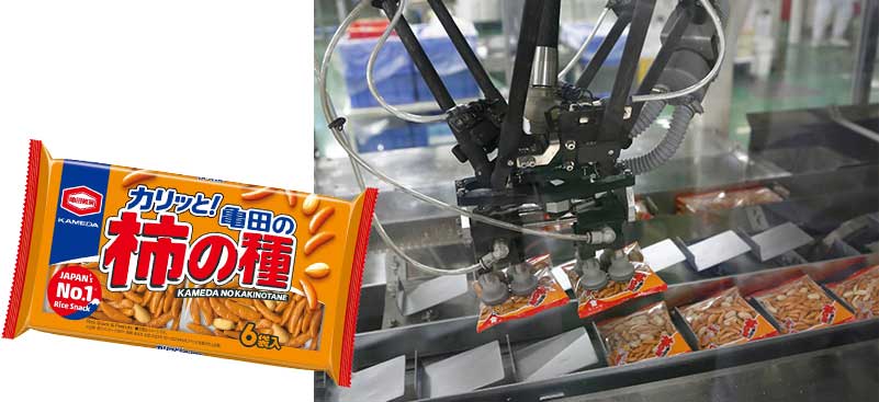6つの個包装を、ひとつの大袋に詰める。このときロボットアームがコンベアで流れてくる個袋をすばやく分配。